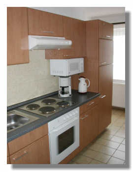 Die komplett eingerichtete Küche beinhaltet Kühl- und Gefrierschrank, Elektroherd, Spüle, Kaffeemaschine, Mikrowelle und Toaster.
